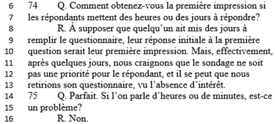 [42] Lorsqu’on lui a demandé en contre‑interrogatoire s’il y avait une limite de temps pour que les participants puissent pour répondre à une question particulière, M. Purther a répondu qu’il n’y en avait pas. Il a en outre précisé qu’ils [traduction] « surveillent ceux qui mettent trop de temps à répondre, après quelques jours »