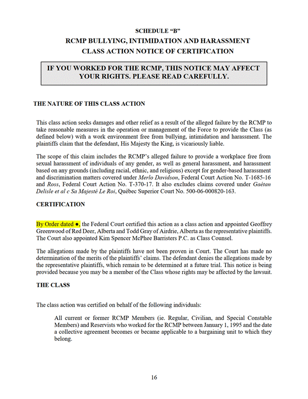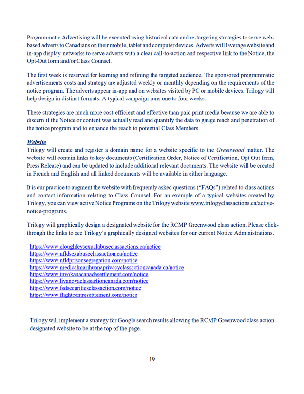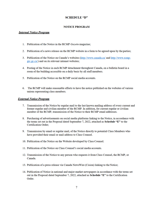 18. Le Canada signifie aux demandeurs et dépose à la Cour un affidavit énonçant les dates auxquelles l'avis d'autorisation de l'instance a été remis et communiqué selon le paragraphe 4 de la section intitulée « Internal Notice Program » (Programme de communication interne) de l'annexe « D ».