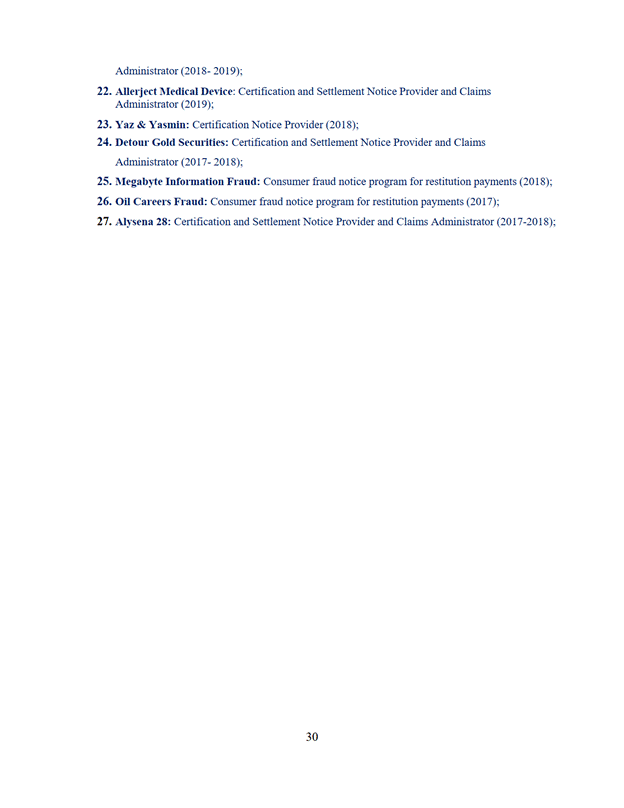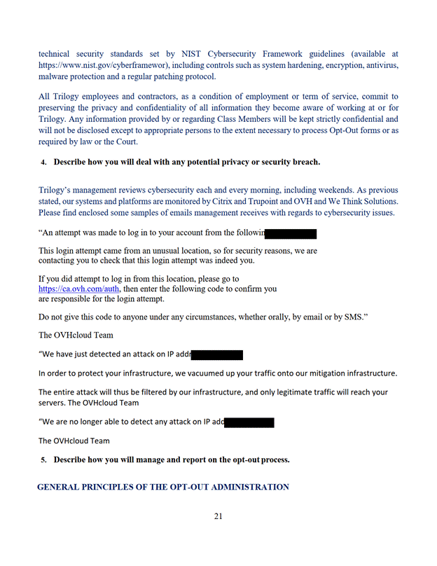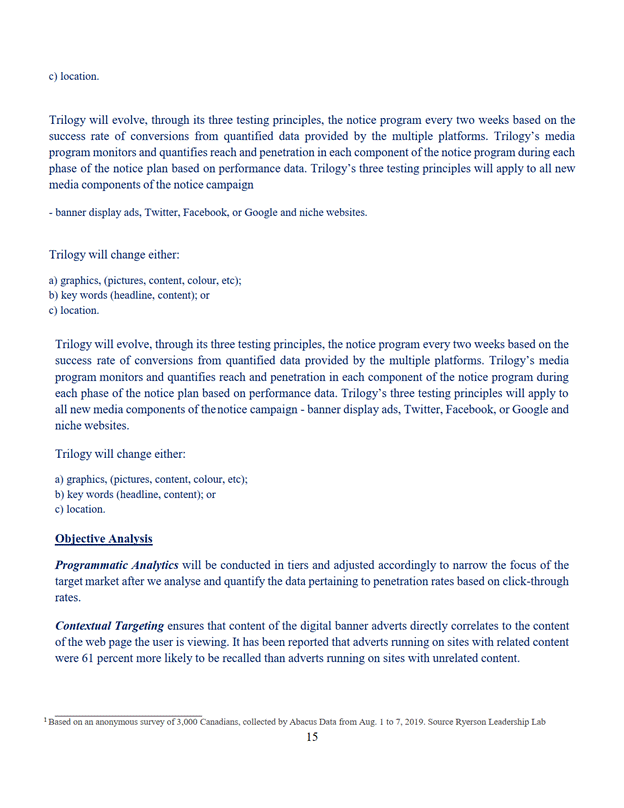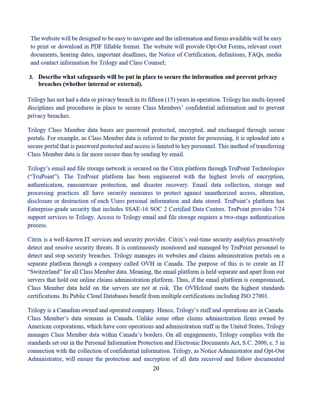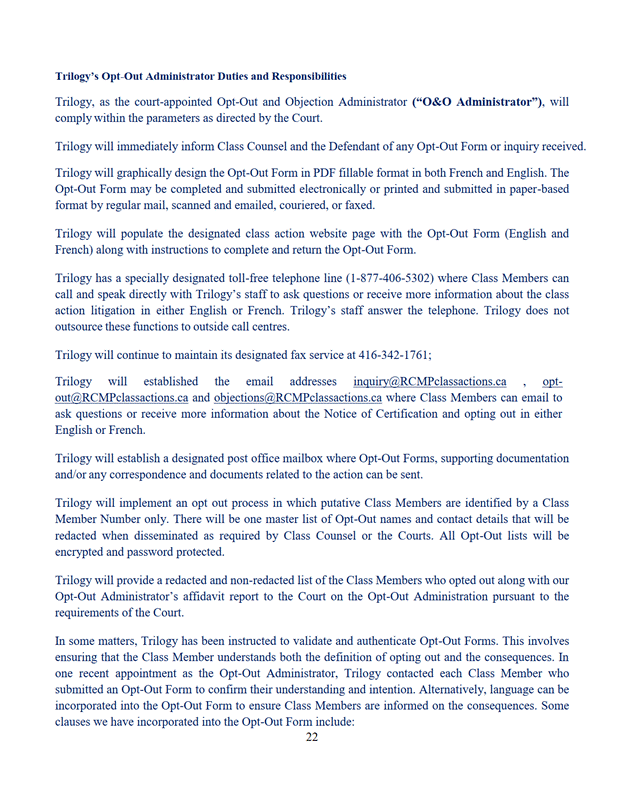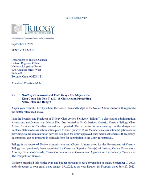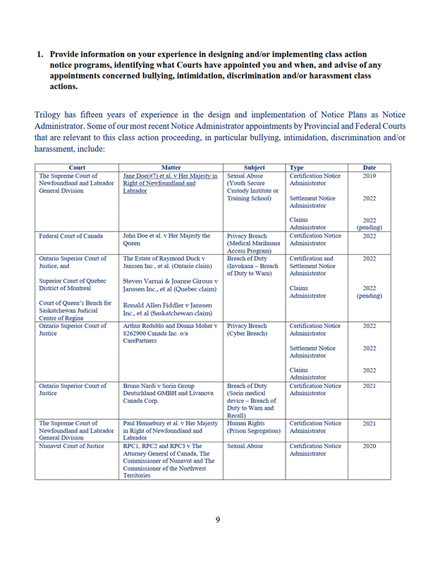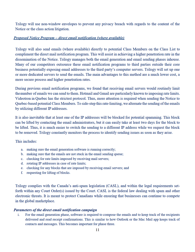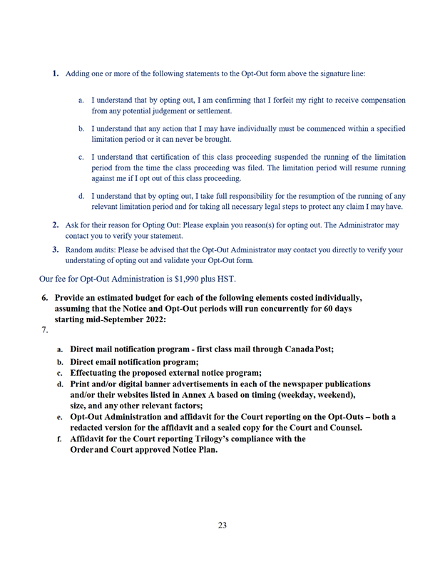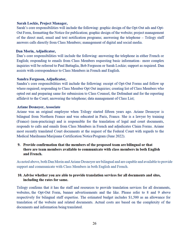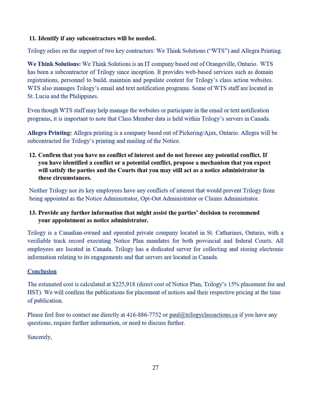 11. La Cour désigne Trilogy Class Action Services comme administrateur du programme de communication selon les modalités de l'offre du 7 septembre 2022 jointe à l'annexe « E ».