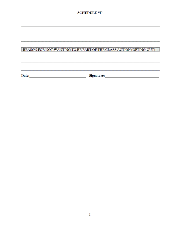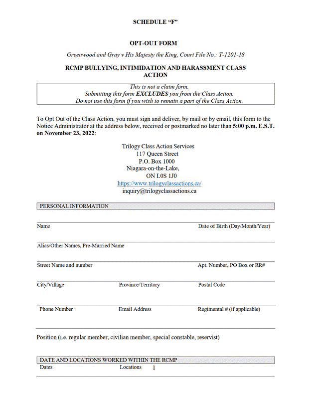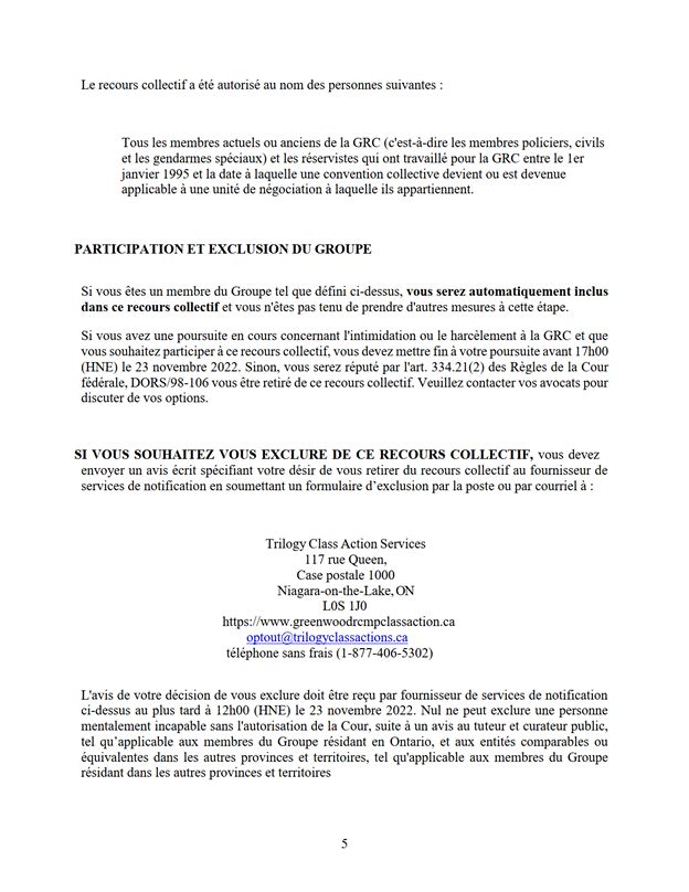 16. Les membres du groupe qui souhaitent s'exclure du recours collectif renvoient le formulaire d'exclusion signé, dont le libellé correspond pour l'essentiel à celui de l'annexe « F » ou de l'annexe « G », à l'adresse indiquée dans l'avis d'autorisation de l'instance, de sorte que le cachet de la poste indique au plus tard le 23 novembre 2022, à 17 h, heure normale de l'Est, ou de sorte que le destinataire reçoive le formulaire au plus tard à ce moment.
