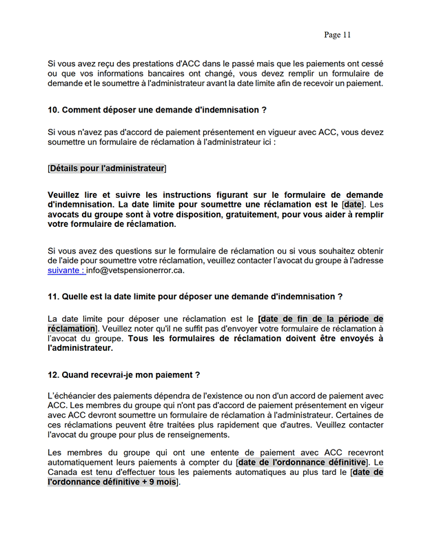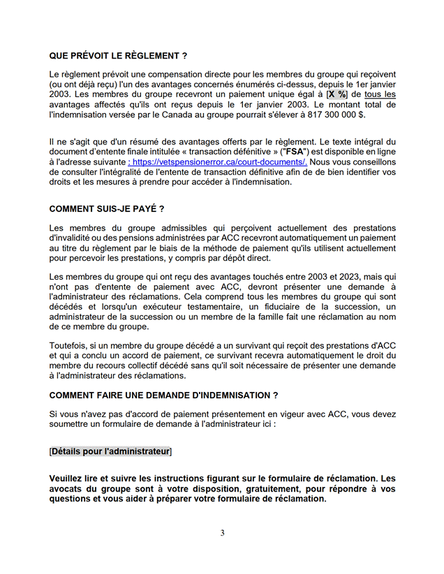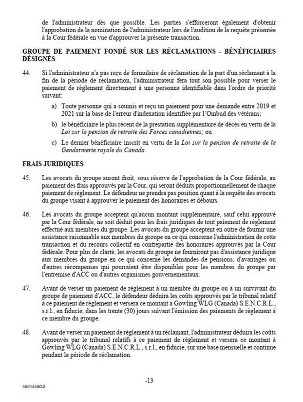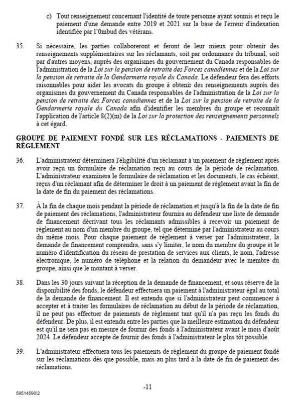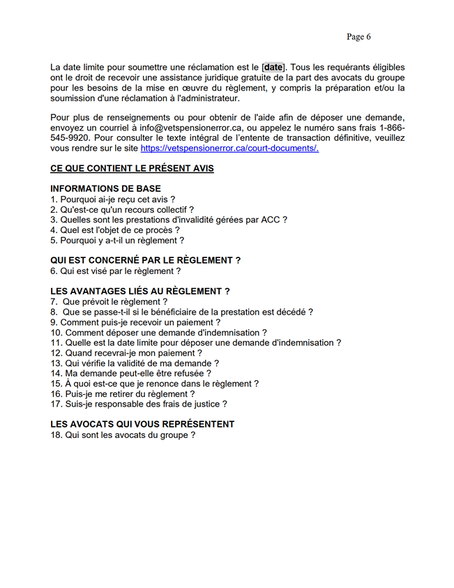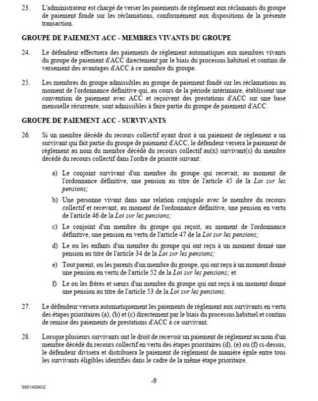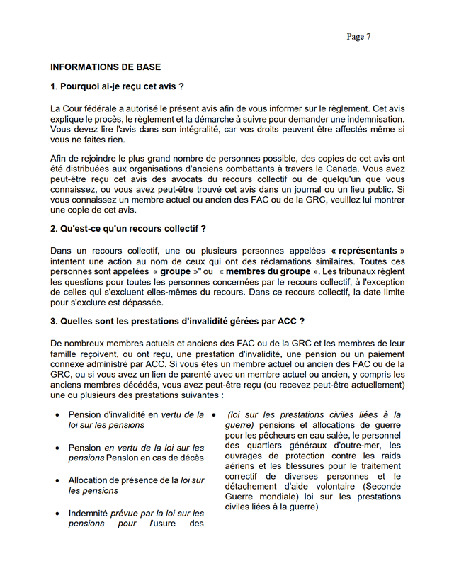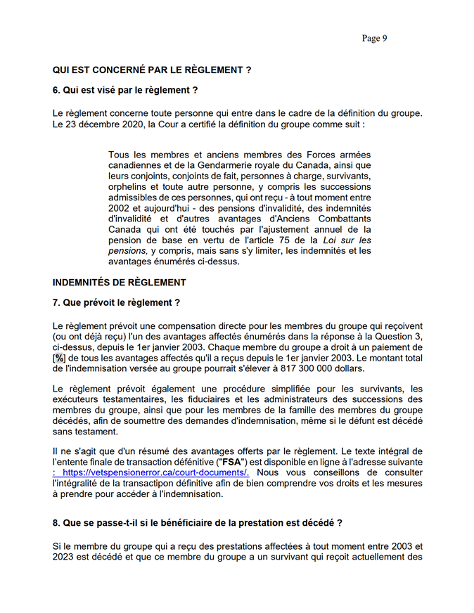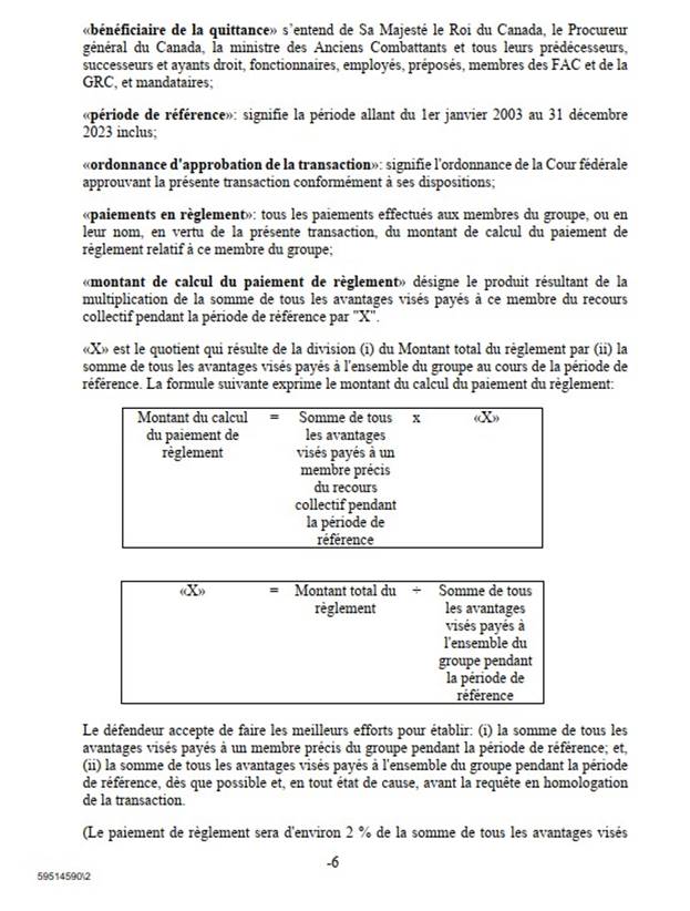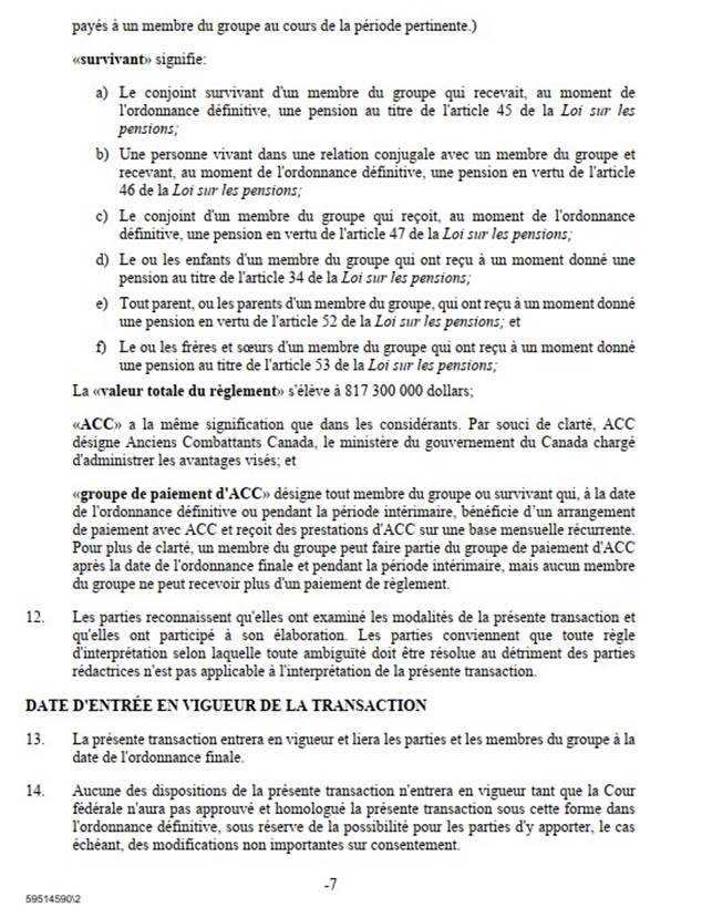 [26] Comme je l’ai mentionné, le règlement découle d’une erreur de calcul des pensions d’invalidité payables aux membres et aux vétérans des FAC et de la GRC ainsi qu’à leur époux ou épouse, à leur conjoint ou conjointe de fait, à leurs personnes à charge, à leurs survivants ou survivantes, à leurs orphelins ou orphelines ou à leurs successions.