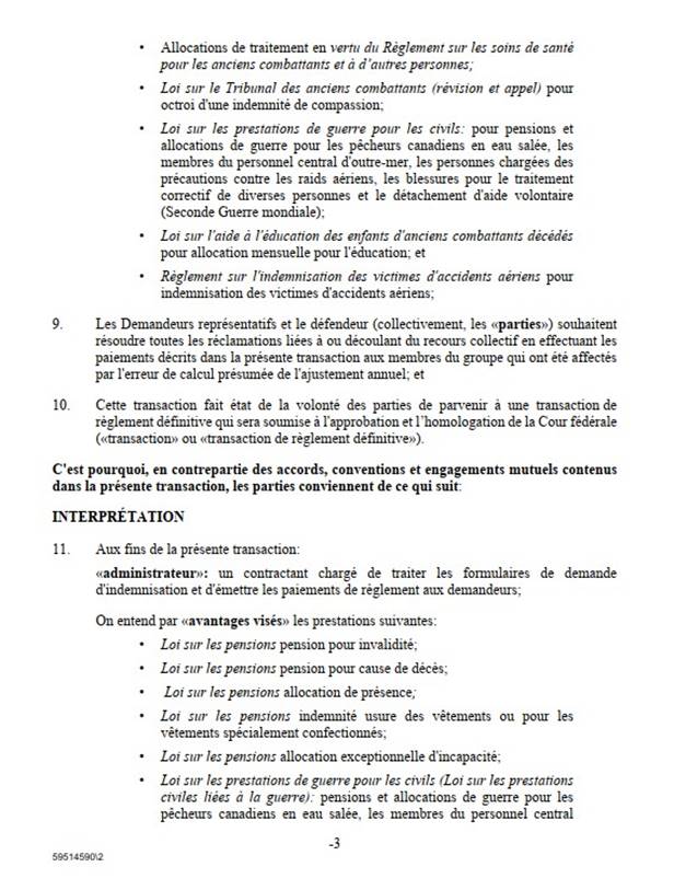 [2] De façon générale, la transaction définitive traite des allégations d’erreurs de calcul et de paiements insuffisants des pensions d’invalidité payables aux membres et aux vétérans des Forces armées canadiennes [FAC] et de la Gendarmerie royale du Canada [GRC] ainsi qu’à leurs époux ou épouses, à leurs conjoints ou conjointes de fait, à leurs personnes à charge, à leurs survivants ou survivantes ou à leurs successions. En 2018, le ministre d’Anciens Combattants Canada [ACC] a reconnu que des erreurs s’étaient glissées dans le calcul des crédits d’impôt provinciaux applicables au taux de salaire, ce qui a entraîné une diminution des paiements de certaines prestations versées aux bénéficiaires admissibles. Le montant total des paiements insuffisants a été estimé à 165 millions de dollars. ACC a alloué 165 millions de dollars pour effectuer des « paiements correctifs »; environ la moitié de ces paiements ont été versés depuis 2018.