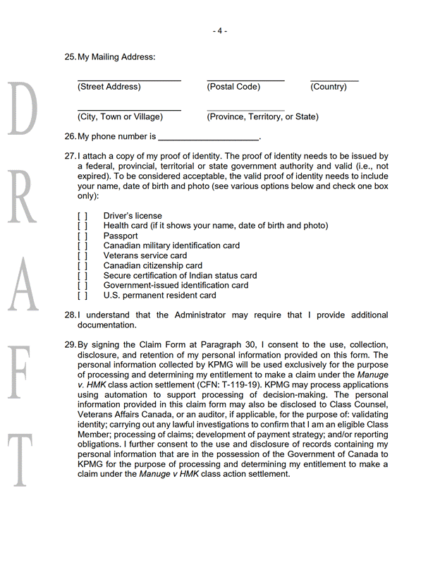 [8] Dennis Manuge est un résident de la Nouvelle-Écosse et un ancien membre des FAC, au sein desquelles il a servi d’août 1994 à décembre 2002. Il a été libéré à cette date, car il souffrait de problèmes de santé qui ne lui permettaient plus de répondre aux exigences professionnelles de l’universalité du service. M. Manuge touche une pension d’invalidité mensuelle depuis 2002. M. Manuge a démontré son implication dans le présent recours collectif, notamment en partageant ses dossiers et en apportant son assistance pour comprendre les erreurs de calcul à corriger.