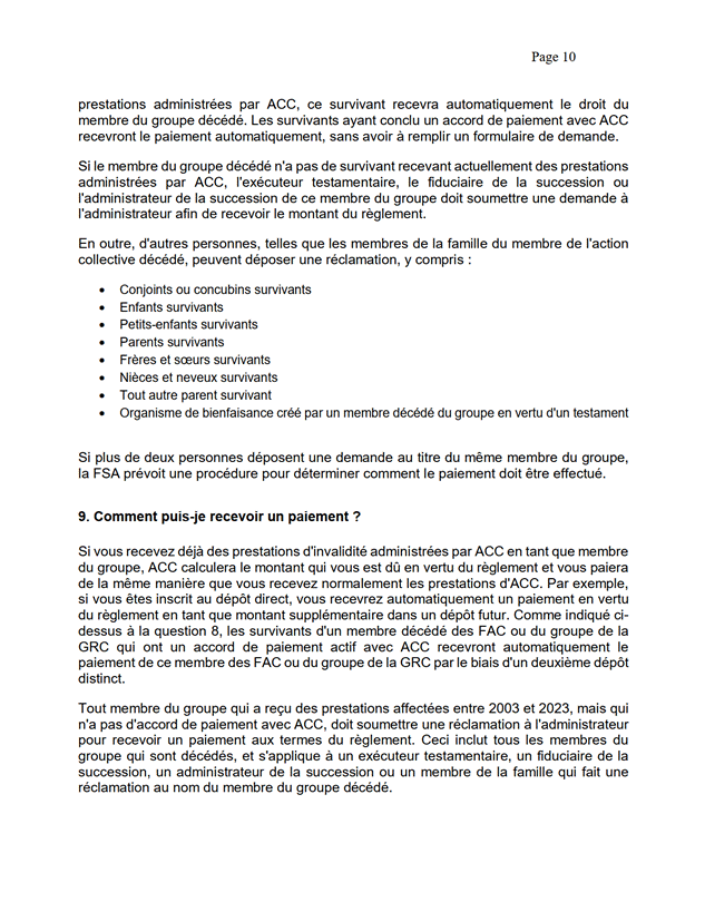 [38] Les membres du groupe se répartissent en deux sous-groupes. Le « sous-groupe de paiement d’ACC » comprend les membres du groupe qui ont déjà une relation de paiement avec ACC. Les membres du groupe qui n’ont pas de relation de paiement existante avec ACC font partie du « sous-groupe de paiement fondé sur les réclamations ». Les membres de ce sous-groupe devront soumettre un formulaire de demande d’indemnisation simple, et l’administrateur évaluera leurs réclamations.
