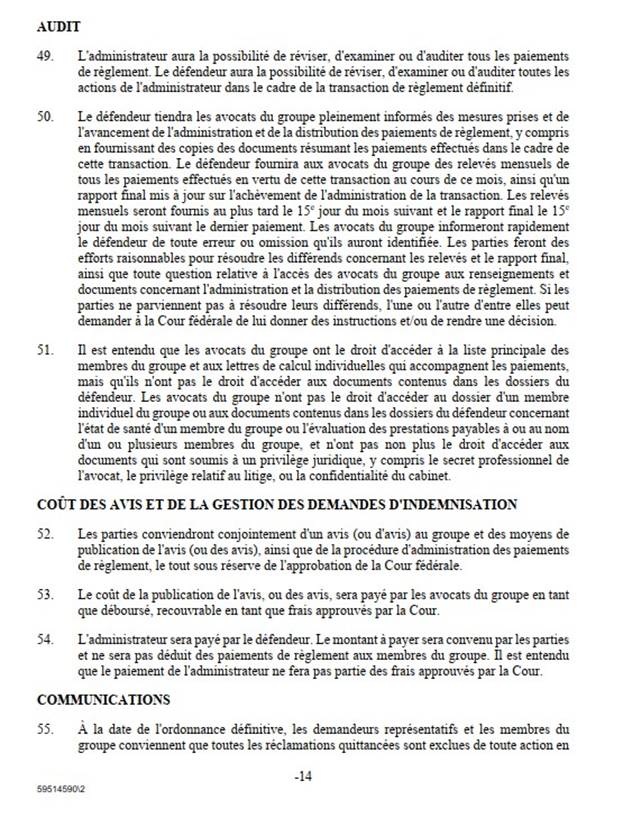 [51] En outre, la correspondance d’un autre membre du groupe à la Cour a été transmise aux avocats du groupe et à l’avocat du défendeur. Les avocats du groupe ont confirmé que les préoccupations exprimées par le membre du groupe concernaient des avantages qui n’étaient pas visés par les erreurs de calcul et qui, par conséquent, n’étaient pas couverts par la transaction définitive. Les avocats du groupe ont confirmé que le membre du groupe n’avait pas été désavantagé.