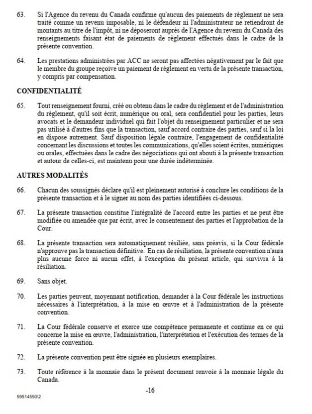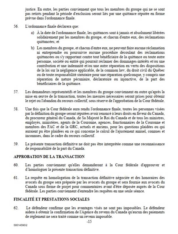 [64] Le défendeur, le procureur général du Canada [PGC], convient que la transaction définitive est juste et raisonnable et dans l’intérêt supérieur des membres du groupe. Il a félicité les avocats du groupe pour la diligence et le professionnalisme dont ils ont fait preuve tout au long des négociations pour donner un excellent résultat aux membres du groupe. Comme l’a fait observer le PGC, bien qu’elle reflète les compromis réalisés par les deux parties, la transaction définitive permettra de verser les paiements aux membres du groupe plus rapidement et plus simplement que ne le feraient le traitement et le calcul des réclamations sur une base individuelle. Le PGC a également exprimé tant la reconnaissance du Canada pour le rôle et l’engagement des membres des FAC et de la GRC et que le soutien actif du Canada à la transaction définitive qui profitera aux membres du groupe.
