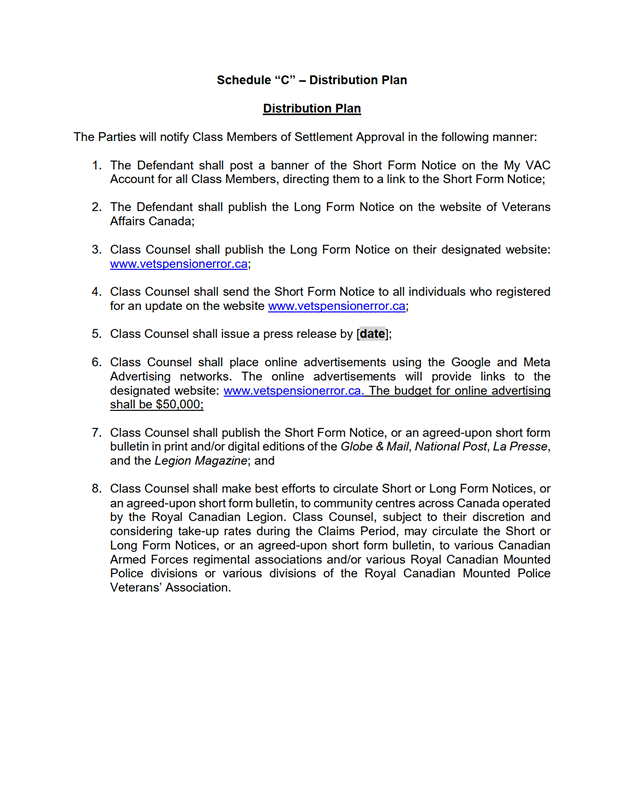 [32] Les avocats du groupe ont également découvert que l’allocation de commisération, qui figurait auparavant dans l’ordonnance d’autorisation en tant qu’avantage visé distinct, avait été versée à titre de pension d’invalidité en vertu de la Loi sur les pensions et avait déjà été incluse dans la liste des avantages visés.