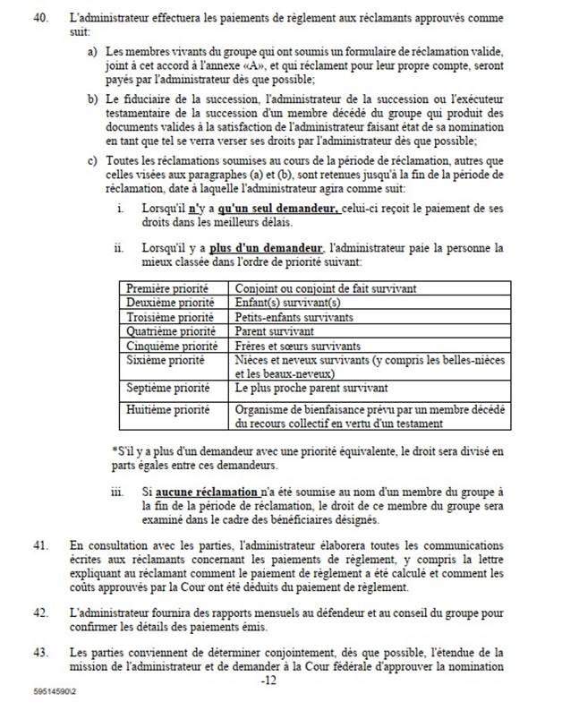 [47] La transaction définitive oblige le défendeur à verser automatiquement les paiements de règlement aux membres du sous-groupe de paiement d’ACC dans un délai de neuf mois à compter de l’ordonnance définitive de la Cour. Les membres du sous-groupe de paiement fondé sur les réclamations devront soumettre un formulaire de demande d’indemnisation à l’administrateur dans les douze mois suivant la présente ordonnance approuvant la transaction définitive. Le défendeur, l’administrateur et les avocats du groupe s’engagent à travailler en collaboration pour aviser les membres potentiels du sous-groupe de paiement fondé sur les réclamations. Tous les paiements seront exonérés d’impôt.