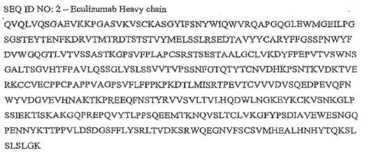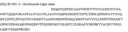 , et précisé que, dans certaines réalisations, l’anticorps est l’éculizumab et la composition pharmaceutique est administrée aux patients atteints d’HPN (brevet 810, P‑1, 3:18‑23). Le brevet indique que, dans certaines réalisations, l’anticorps qui se lie à la protéine C5 possède une chaîne lourde constituée de la SEQ ID NO:2 et une chaîne légère constituée de la SEQ ID NO:4 (brevet 810, P‑1, 5:30-33). On y trouve la séquence complète d’acides aminés pour les séquences SEQ ID NO:2 et SEQ ID NO:4, entre autres (brevet 810, P‑1, 44), identifiées dans la liste des séquences comme étant les séquences de l’éculizumab.