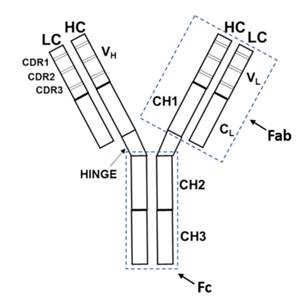 a)Les anticorps sont des protéines tridimensionnelles complexes, en forme de Y, qui comptent deux chaînes lourdes (HC) et deux chaînes légères (LC) identiques, chacune avec une région variable (VL et VH) à l’extrémité de chaque bras du Y, et une région constante (CL et CH) [Tessier, P‑27 et P‑28, para 24‑25; Casadevall, P‑24, para 45‑46, 50; Bertelli, P‑19, para 27‑29).