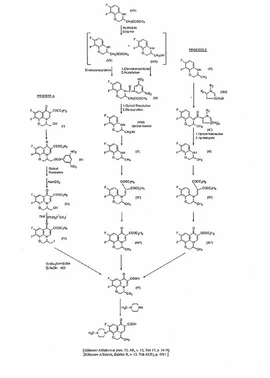 [29] Les travaux relatifs au procédé C ont débuté à l’automne de 1985. Cette demande a révélé que la configuration absolue de la lévofloxacine était la forme « S » et elle faisait également état de sa [traduction] « solubilité supérieure et sa toxicité inférieure ». (Affidavit d’Hayakawa, paragraphes 43-48, DD, volume 4, onglet 6, pages 720-721; affidavit de Klibanov, pièce I, page 2, DD, volume 13, onglet 18, page 3783.)