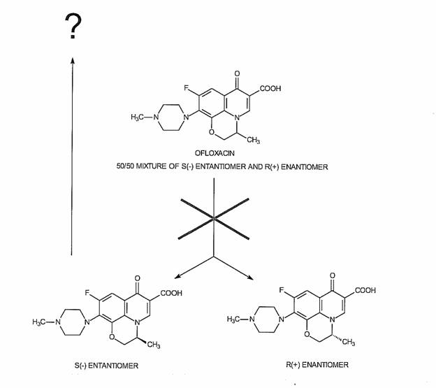 [13] Dans le cas de l’ofloxacine, un énantiomère est qualifié d’ofloxacine (+)- (ou, subsidiairement, d’ofloxacine R- ou ofloxacine R(+)). L’autre énantiomère est désigné ofloxacine (-) (ou, subsidiairement, ofloxacine S- ou ofloxacine S(-)). Pour les besoins de la présente espèce, il est important de signaler que l’énantiomère S ou (-) de l’ofloxacine porte le nom de « lévofloxacine ».