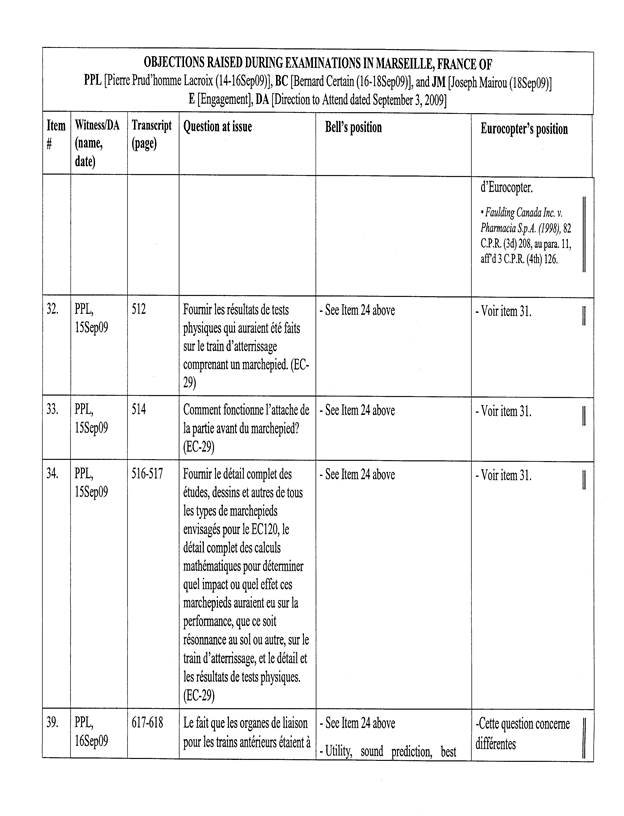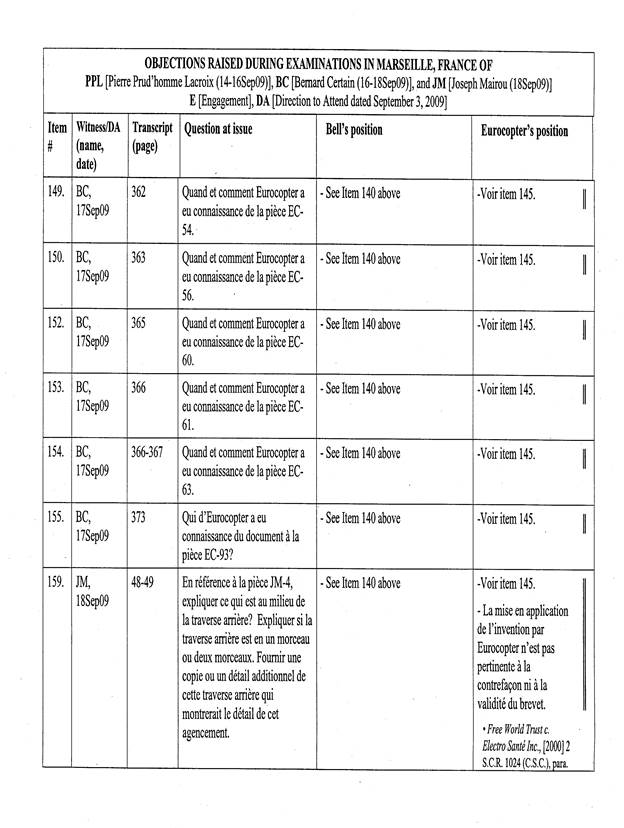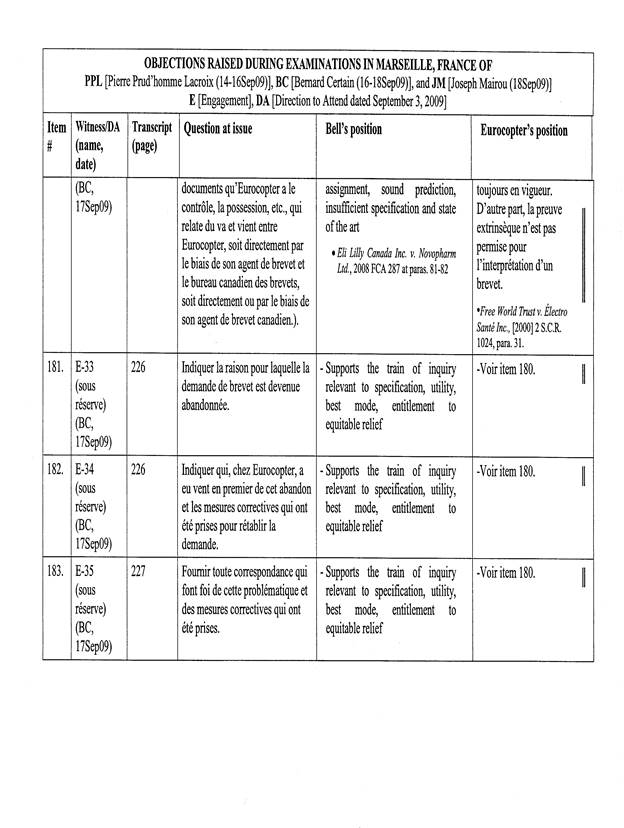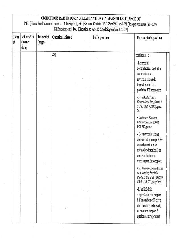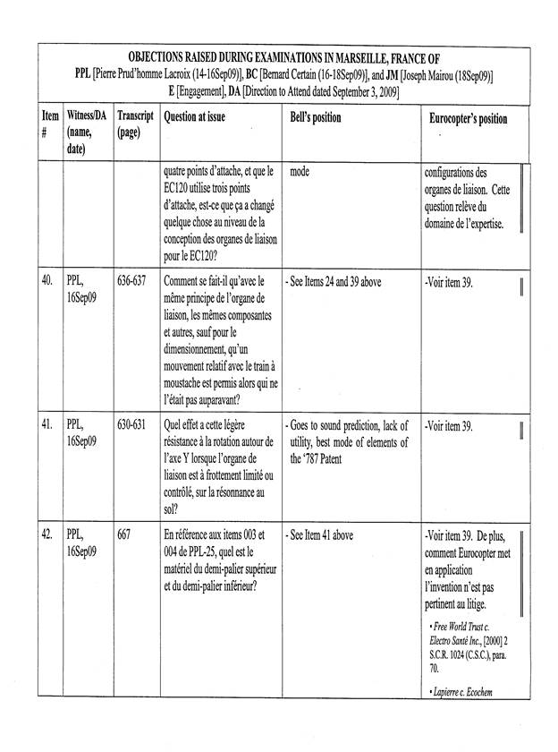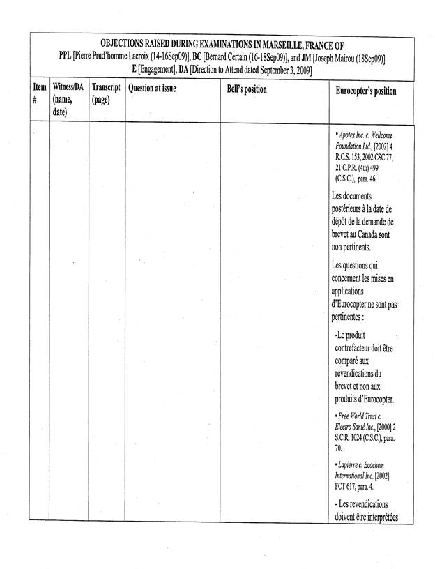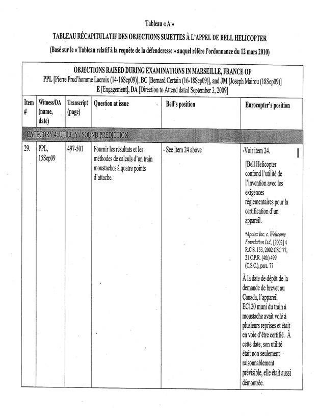 [5] Pour les fins de cet appel, un « Tableau récapitulatif des objections sujettes à l’appel de Bell Helicopter », basé sur le tableau annexé à l’ordonnance du protonotaire, a été préparé par les procureurs d’Eurocopter. La confidentialité de ce dernier document n’est pas revendiquée par les parties, de sorte que celui-ci est reproduit en annexe (Tableau « A »).