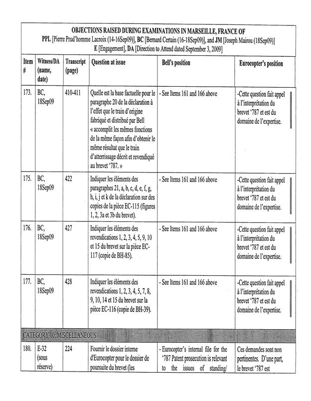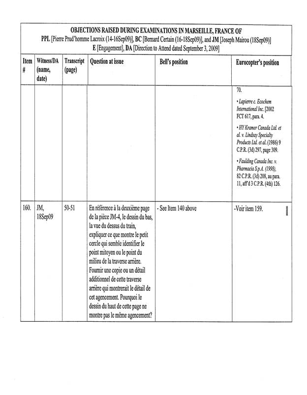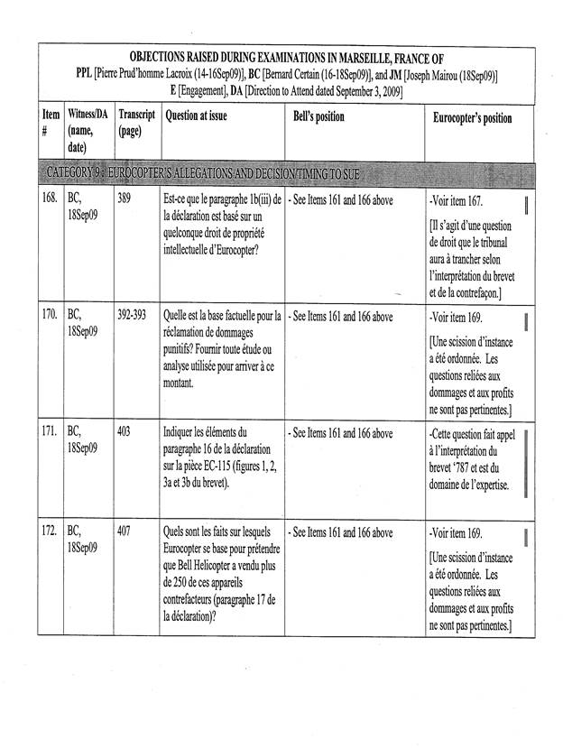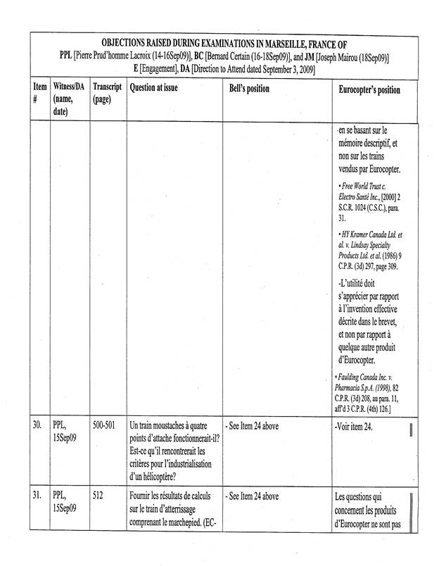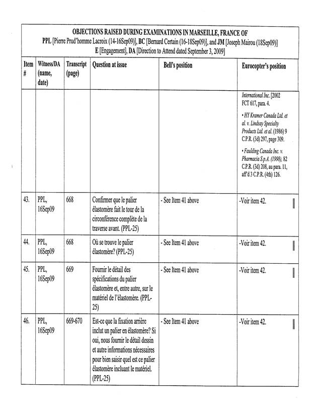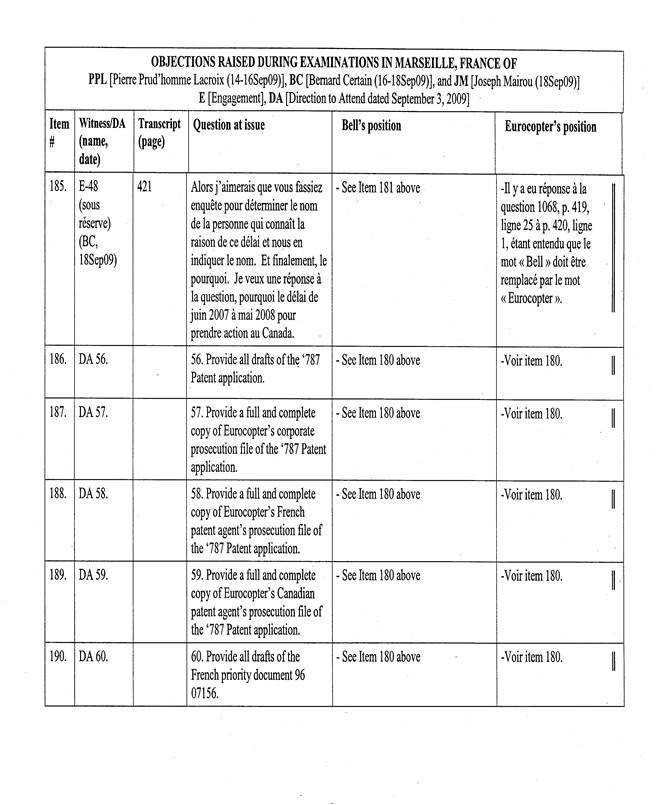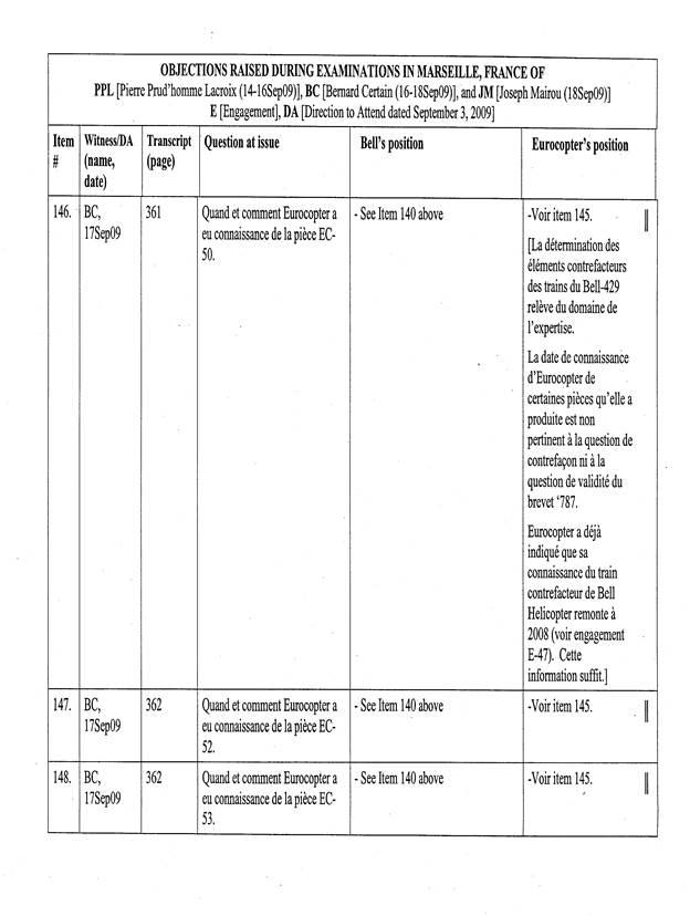 [5] Pour les fins de cet appel, un « Tableau récapitulatif des objections sujettes à l’appel de Bell Helicopter », basé sur le tableau annexé à l’ordonnance du protonotaire, a été préparé par les procureurs d’Eurocopter. La confidentialité de ce dernier document n’est pas revendiquée par les parties, de sorte que celui-ci est reproduit en annexe (Tableau « A »).