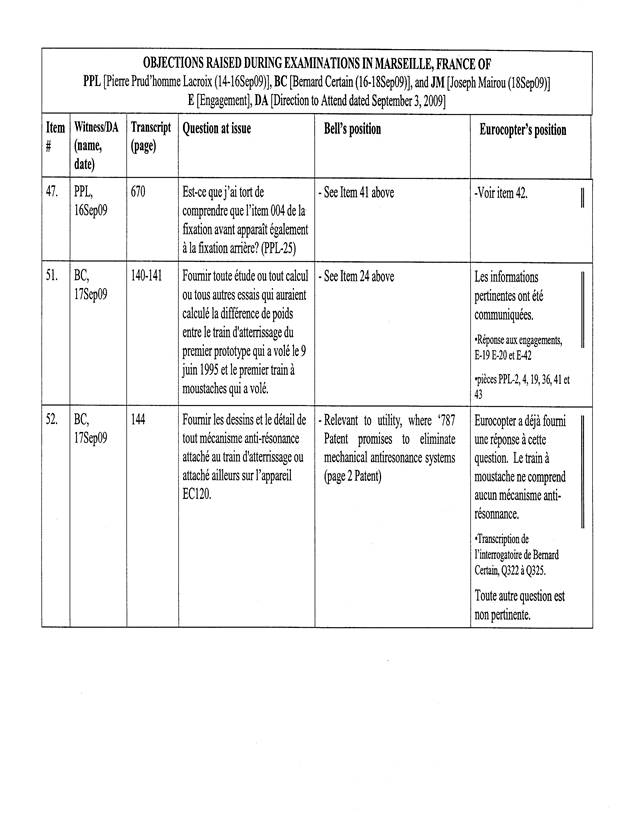 [1] À l’occasion des interrogatoires au préalable de Messieurs Bernard Certain, Pierre Prud’homme Lacroix et Joseph Mairou, conduits en France au mois de septembre 2009 (la première ronde), Eurocopter s’est objectée à diverses questions et demandes de documents formulées par Bell Helicopter Textron Canada Limitée (Bell Helicopter).