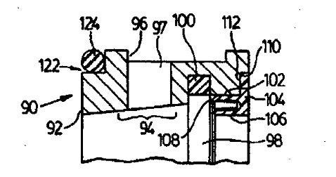 g) un joint torique en forme de U dans la section radiale, comprenant deux bras. L’un des bras est adapté pour reposer sur la surface cylindrique extérieure et l’autre est adapté pour reposer sur la surface de soutien, de manière à ce que l’intérieur de la forme en U soit ouvert vers le premier espace ouvert. Le joint torique comporte une bride intégrale saillante reposant dans un renfoncement de bride dans la cartouche d’étanchéité respective, de manière à ce que la bride soit comprimée et serrée entre la cartouche respective et la prochaine cartouche adjacente.