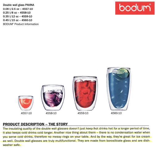 [12]           Bodum a présenté ses verres à double paroi pour la première fois en août 2003 lors de la foire commerciale Ambiente à Francfort en Allemagne.