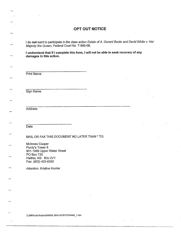 [5] La présente affaire a été instruite à Halifax, le 20 juin 2014. Selon l’affidavit de Daniel Wallace, il appert que l’avis préliminaire du règlement proposé a été envoyé par la poste régulière aux 1056 membres du groupe proposé, et que 126 exemplaires de la lettre ont été retournés car ils n’avaient pu être délivrés. Les avocats du groupe proposé ont aussi envoyé l’avis préliminaire à 160 membres faisant partie de leur liste de diffusion. L’avis est aussi publié sur Internet, notamment sur le site Web d’Anciens Combattants Canada. Je suis convaincu qu’un avis valide a été envoyé à la plupart des membres du groupe proposé et que les réponses reçues sont représentatives de l’opinion du groupe. Sur les 50 réponses reçues en date du 5 juin 2014, seulement trois d’entre elles faisaient part de réserves à propos des modalités du règlement et aucune ne faisait état de préoccupations à propos de l’autorisation. Lors de l’audition de l’affaire, plusieurs membres du groupe proposé étaient dans l’assistance, mais seul David White, le demandeur, a choisi de formuler des observations à la Cour. Il a exprimé son appui sans réserve à l’égard des modalités du règlement et du montant demandé en ce qui a trait aux honoraires et aux débours.