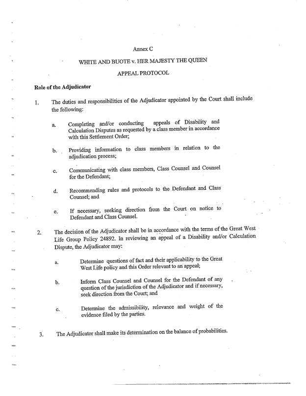 [21] Si un différend survient au sujet de la question de savoir si un membre du groupe à prestations nulles, y compris les membres décrits au paragraphe 18, était invalide (le différend quant à l’invalidité), le membre en question disposera de 90 jours pour interjeter appel devant l’arbitre à l’encontre de cette décision (l’appel quant à l’invalidité), conformément aux dispositions du protocole d’appel, joint à la présente ordonnance à l’annexe C. Les membres du groupe à l’égard desquels on a déjà conclu qu’ils n’étaient pas complètement invalides au titre du régime d’ILD de GWL peuvent aussi, s’ils déclarent qu’ils n’ont pas interjeté appel de cette décision relativement à l’application de la compensation, interjeter appel devant l’arbitre. Great West, avant que cet appel soit instruit par l’arbitre, peut réexaminer la question de savoir si le membre du groupe souffre d’une invalidité complète, et si le membre du groupe déclare qu’il n’a pas interjeté appel de cette décision en raison de l’application de la compensation.