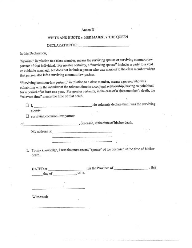[27] Les éventuels demandeurs de paiements au titre du paragraphe 25 à l’égard des membres du groupe décédés devront signer la déclaration figurant dans le formulaire joint à l’annexe D de la présente ordonnance (pour époux et conjoints de fait) ou la déclaration figurant à dans le formulaire joint à l’annexe E (pour enfants).